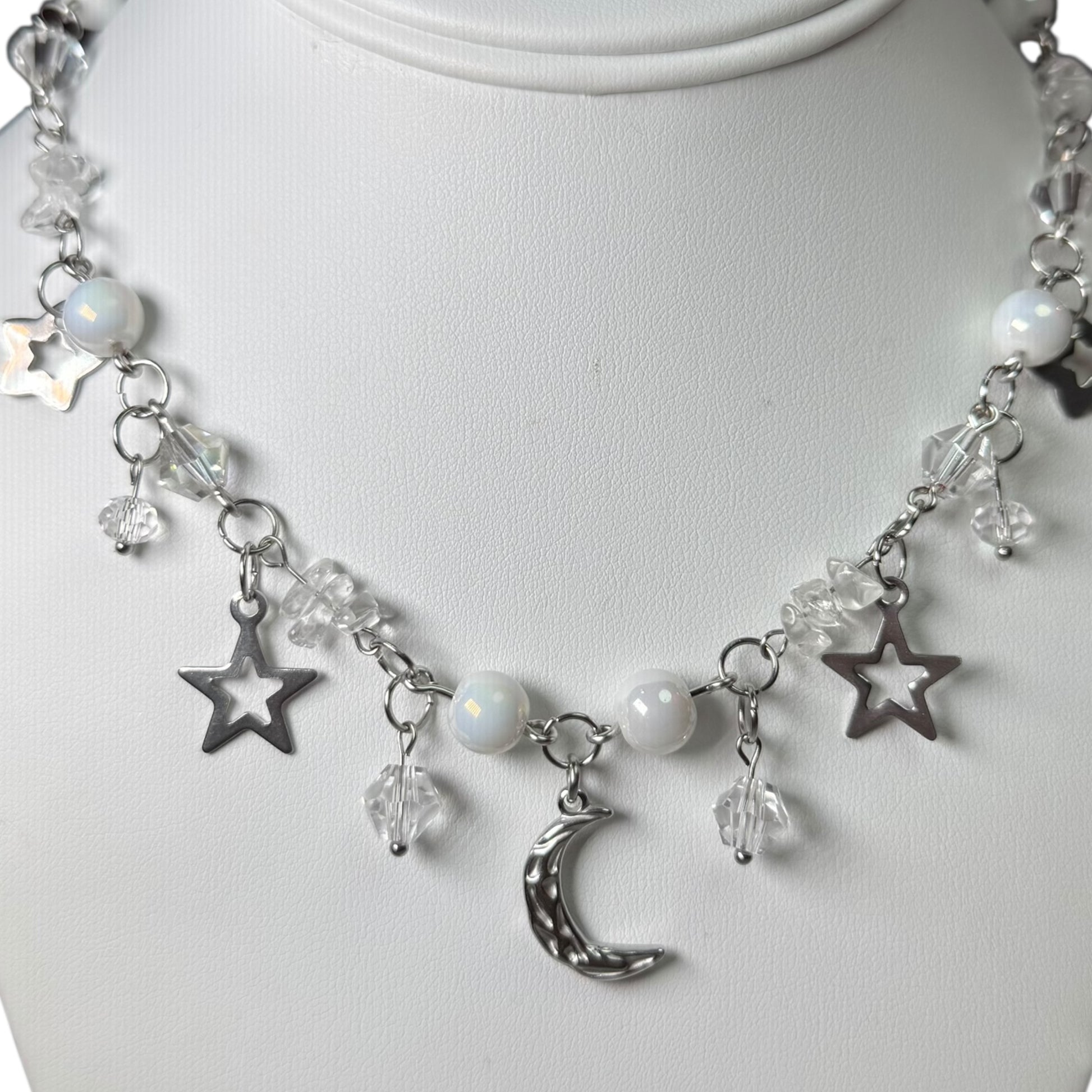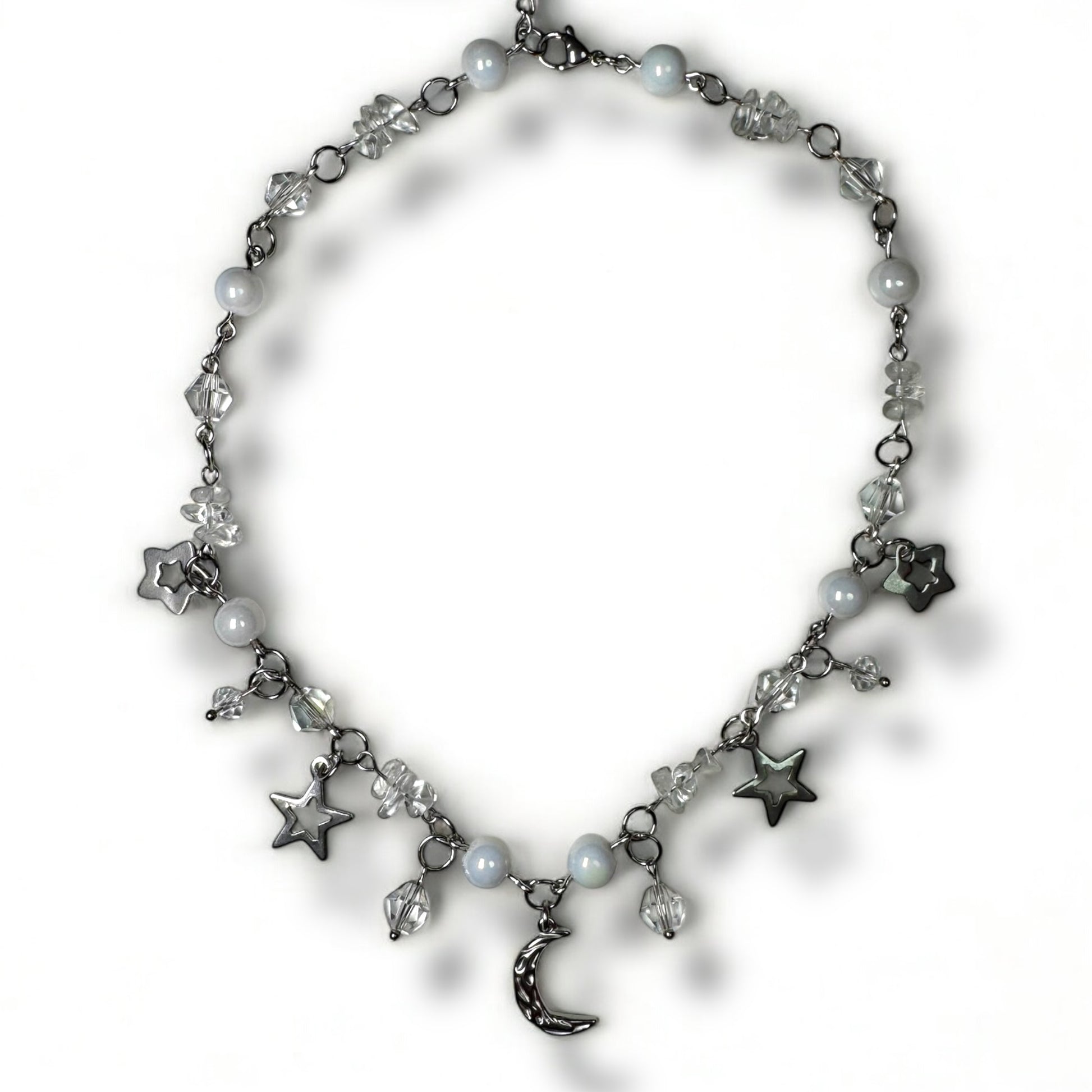 The Fairydust Necklace brings a touch of moonlit magic to any look. Made with white glass beads and quartz crystals, it features a stainless steel moon pendant surrounded by tiny star charms. Soft, dreamy, and easy to style — it’s the perfect piece to add a little sparkle to your everyday vibe.