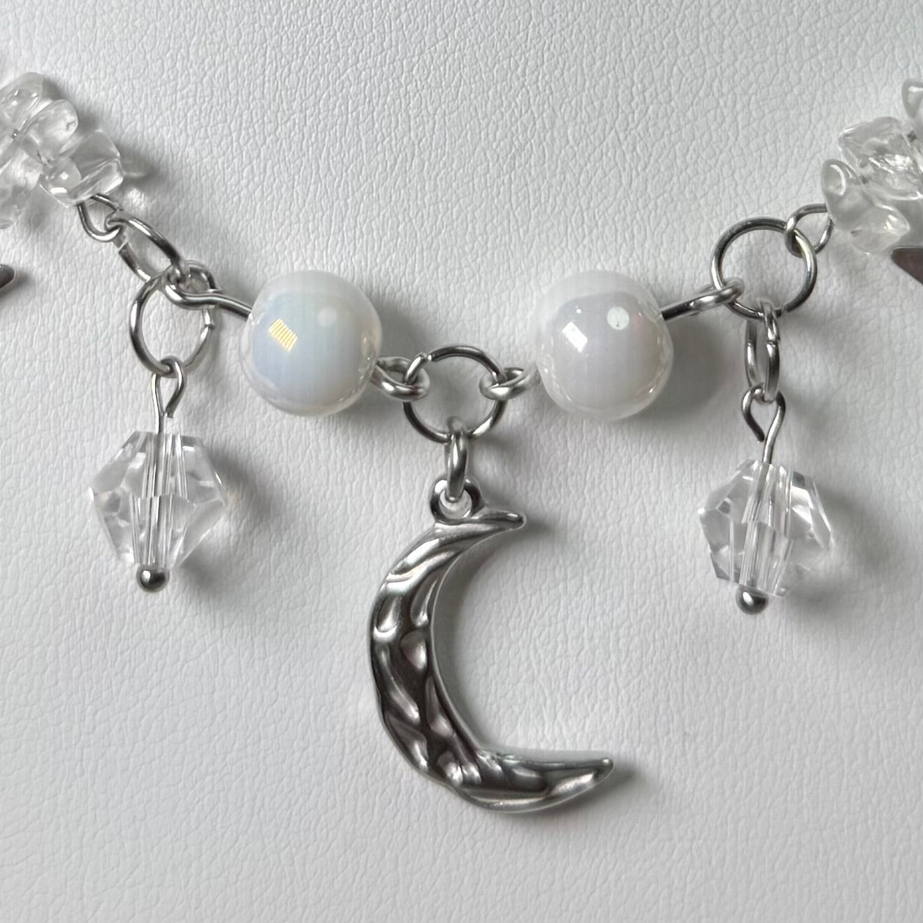 • White glass beads + quartz crystals